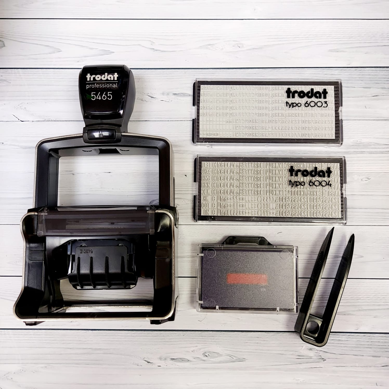 Датер на автоматической металлической оснастке Trodat Professional 5465 самонаборный 4 строки, размер 56х33 мм. Высота шрифта - 4 мм., буквенное обозначение месяца, казахский русский. В комплекте 2 кассы букв казахская и русская.