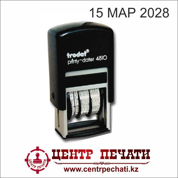 Датер на автоматической оснастке Trodat Printy 4810. Установка даты производится с помощью специального колёсика. Оснастка укомплектована сменной штемпельной подушкой синего цвета.