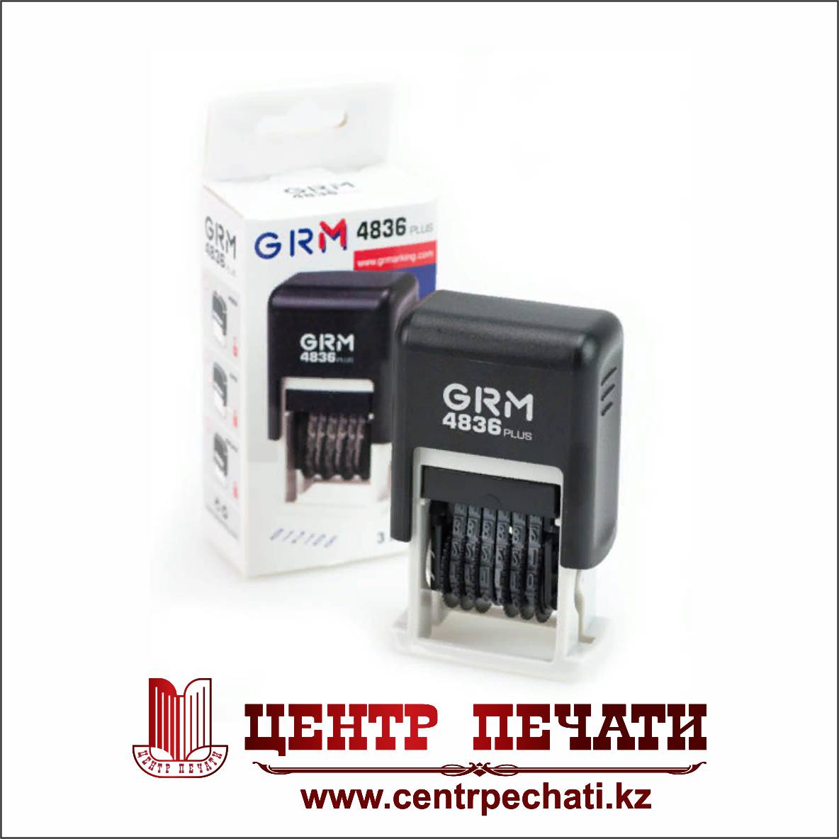 Нумератор на автоматической оснастке GRM 4836 PLUS. Прочный пластиковый корпус оснастки гарантирует длительное время использования. Установка значений производится с помощью специального колёсика. Оснастка укомплектована сменной штемпельной подушкой синего цвета.