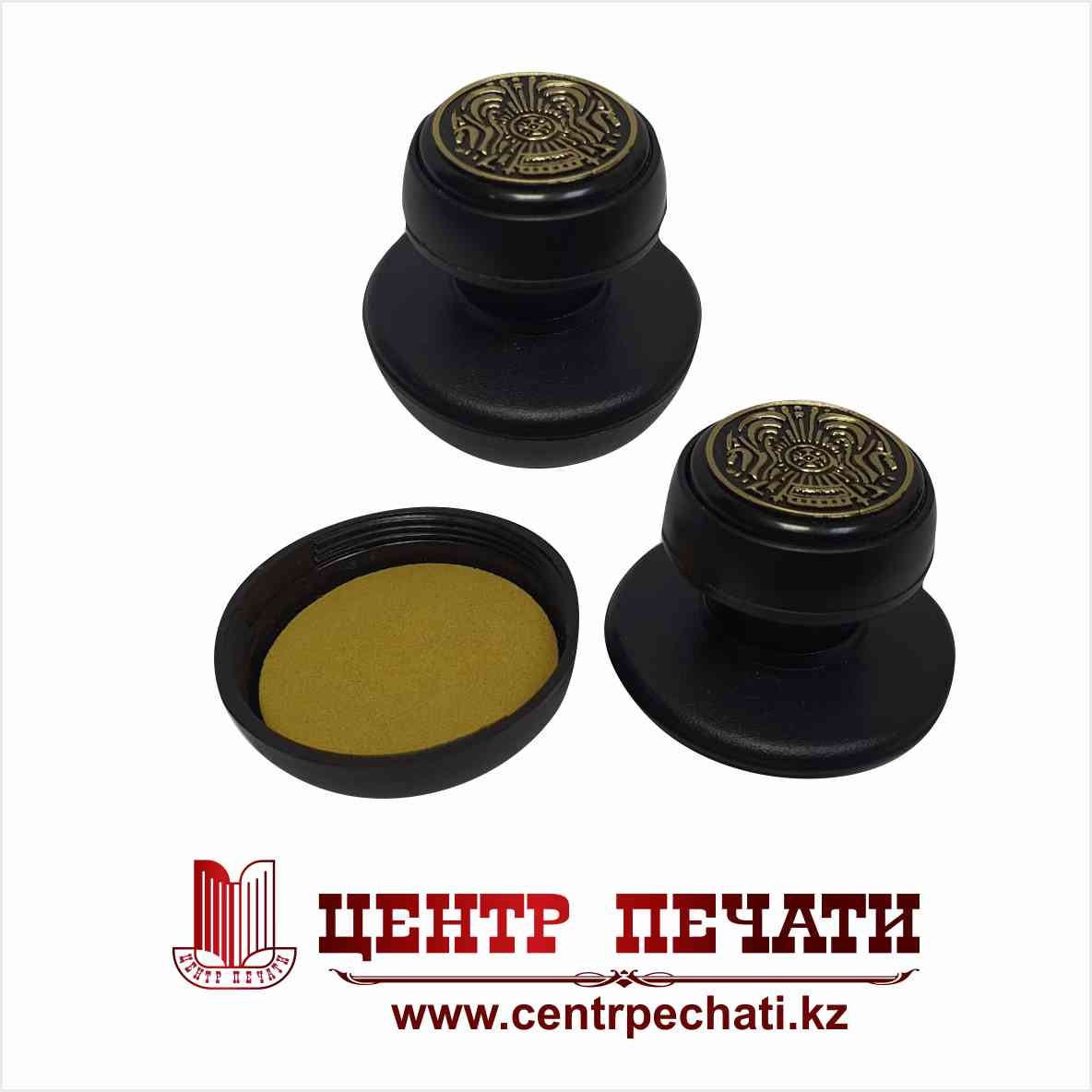 Ручная пластмассовая оснастка для круглой печати имеет встроенную штемпельную подушку. Окрашивание клише происходит в полуавтоматическом режиме, путем нажатия на кнопку в ручке. На ручке имеет золотое рельефное тиснение Герба Казахстана.